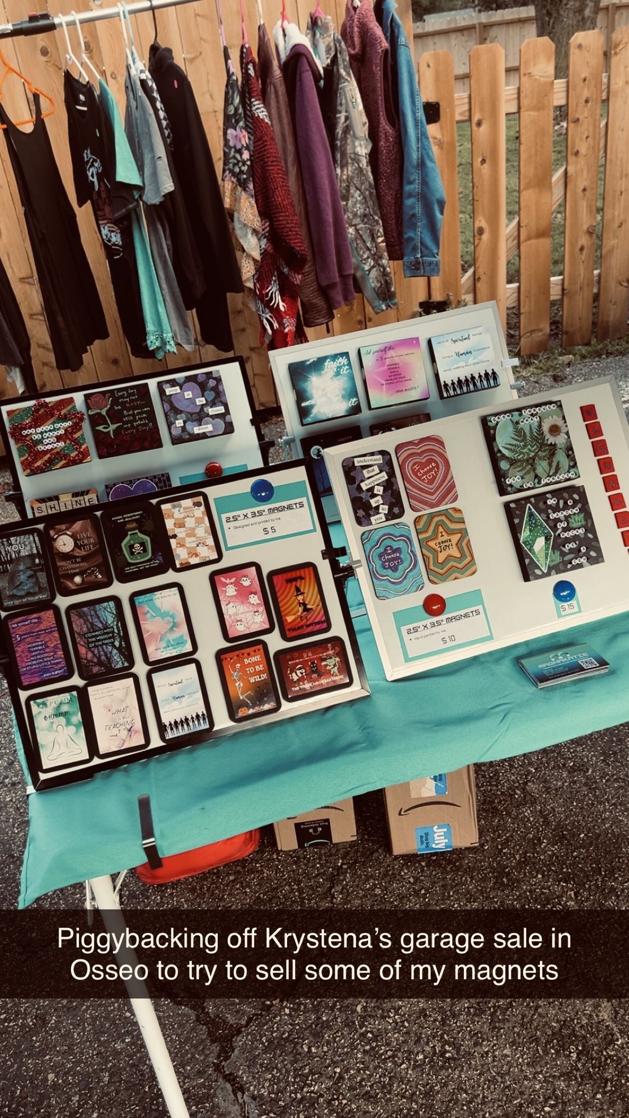 This past Saturday we arrived at my best friend’s house around 10 am or so and set up my table with my magnet display boards in an open spot underneath her canopy tent.