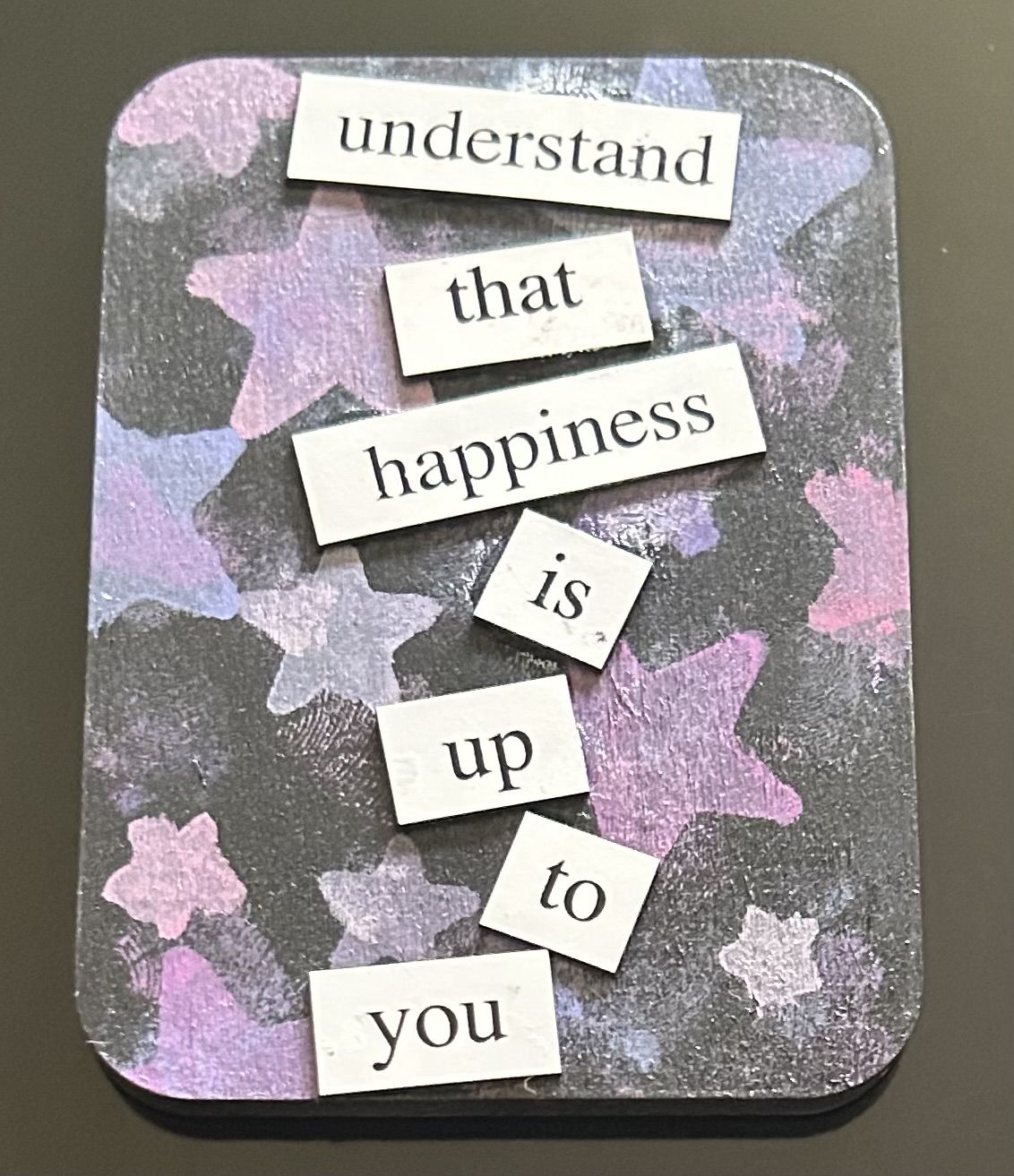 The magnet she chose couldn’t have been more perfect to be my first “non friends and family” sale. I made it on a mental health day I took off work when I was feeling depressed and just needed to create something. It has white, pink, and purple stars on it with a message strung together made from various magnetic poetry tiles: “remember that happiness is up to you”