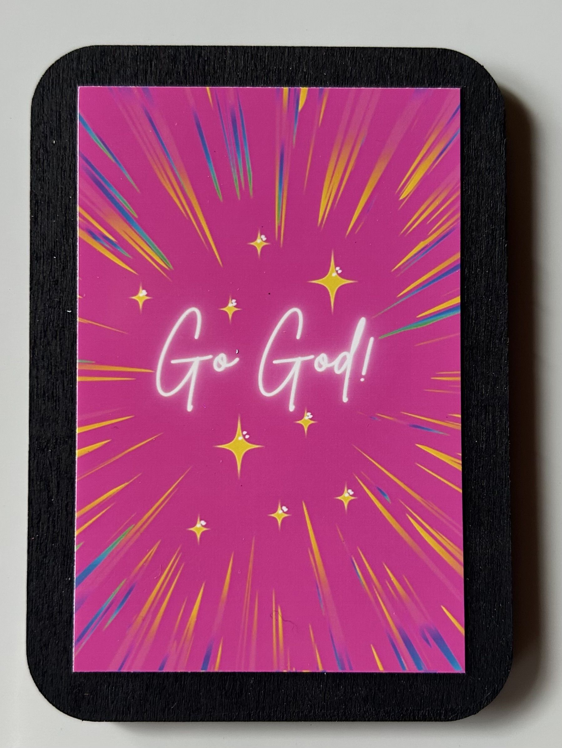 Here are my printed designs. “Go God!” is one of my Mom’s favorite sayings, basically praising God for all the good he provides; the miracles, the blessings, the unexpected surprises – she had this as her license plate, and she put it on a pillow she made, and I created a larger hand painted version of it for her birthday as a gift. I am hoping that others will like her coined sentiment as well, so I made a smaller version of it for magnets!