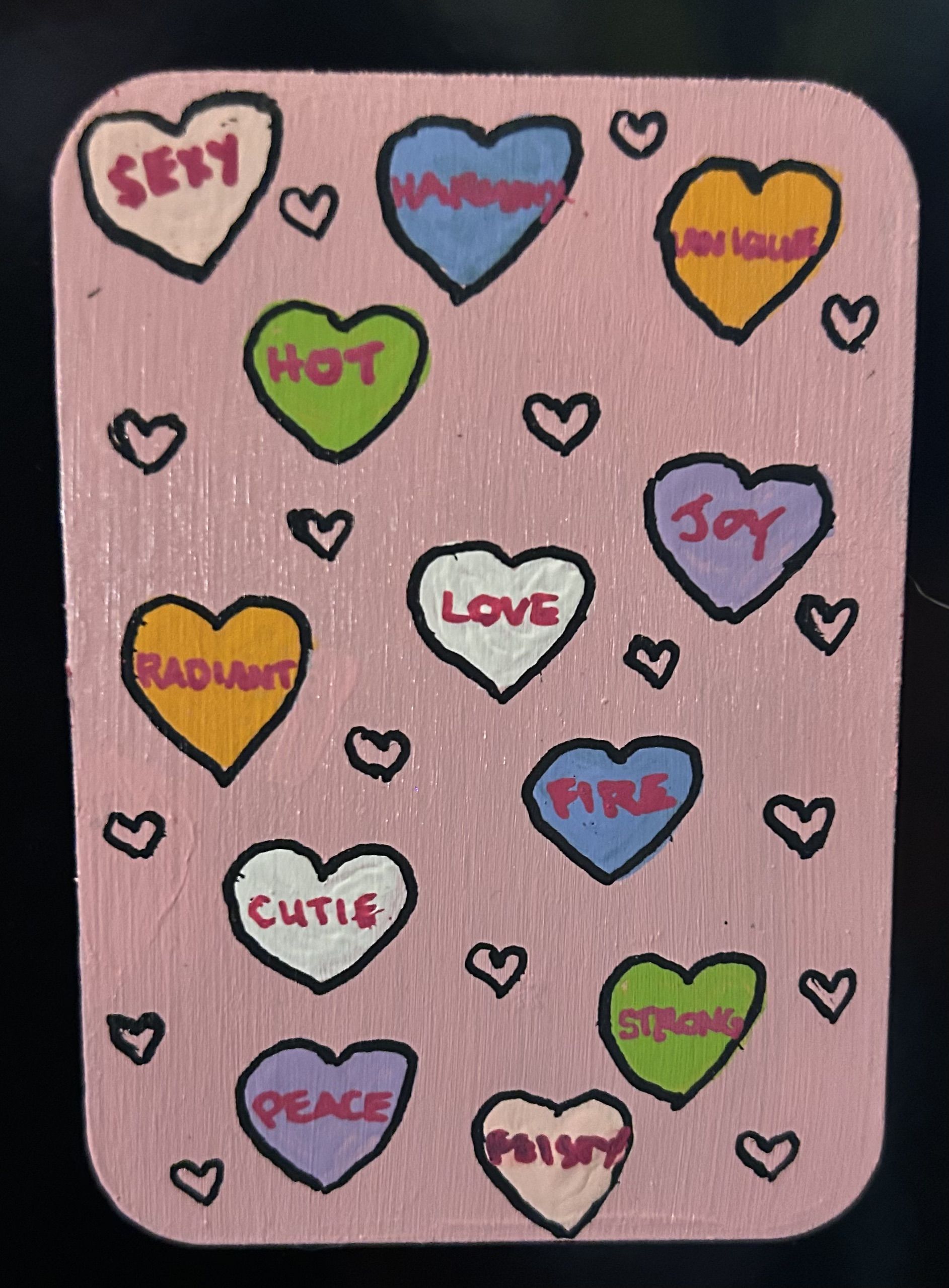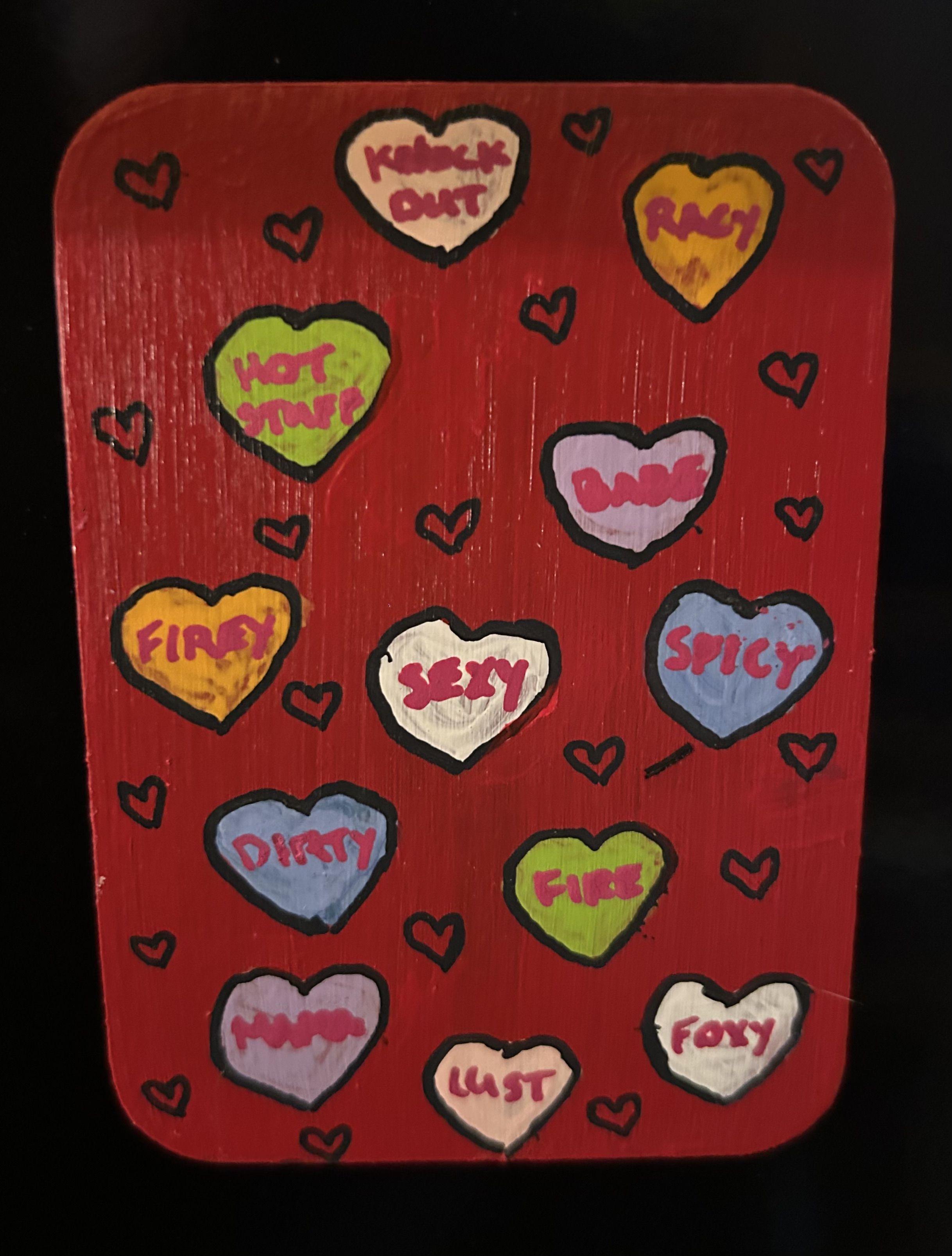 These were the magnets I was honestly looking forward to doing the most, but they turned out to be my least favorite of the bunch. I had wanted them to look more 3D, and it would have required adding a lighter tint on one of the sides of each heart of each color. Yes, I could have done it, but I just didn’t have the energy bandwidth to do it. Just being honest! I also think the hearts turned out a little sloppy. I will try this one out again next year for sure. It’ll be interesting to see if I can improve! What I do love about these is each heart has their own little saying, just like the candies we ate as kids (or maybe we still eat them, I don’t know) ~ For the lighter pink one, I wanted to convey messages about inner beauty, confidence, and everything positive and light in the world, and for the red one I wanted to convey more of a spicy, sultry, x-rated, bedroom type messages. However, I couldn’t think of enough words for each theme so some were repeated on both. Oh well!
