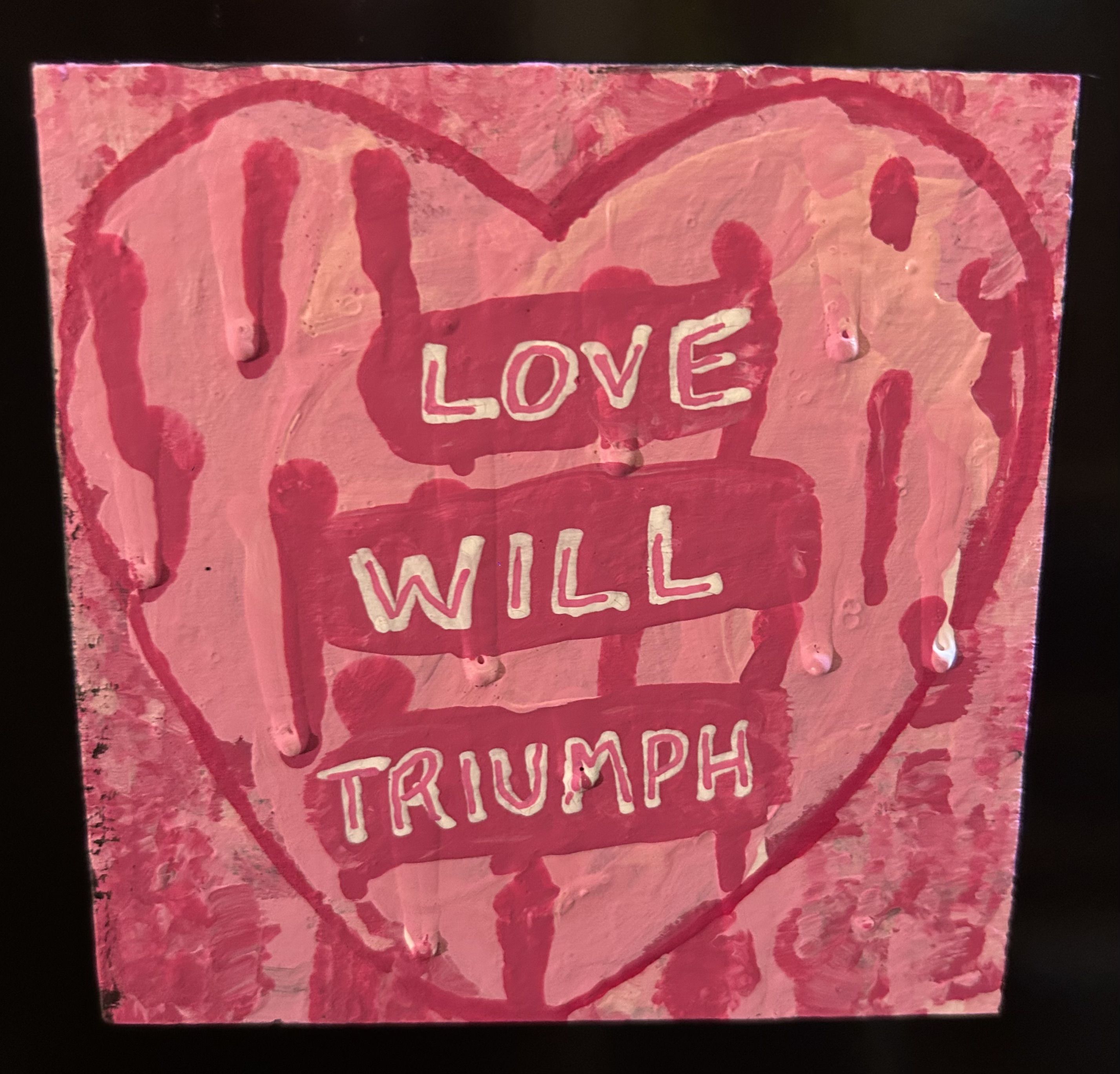 Another checkered mess salvaged by a little bit of paint blending. The message is simple, and it’s one of hope for brighter days ahead. LOVE WILL TRIUMPH. Hate gets us nowhere, fast, and it does not matter what “side” it is coming from. This follows the “lead with love” theme that most (though not all) of these magnets in this batch embody. I started off with that paint drip “bleeding” technique and then scratched that completely painted the heart solid. You can still see the paint drip bumps covered under the top paint layer. I feel that it delivers the message well that even though we are struggling, and our hearts are hurting, we can absolutely overcome it with love.