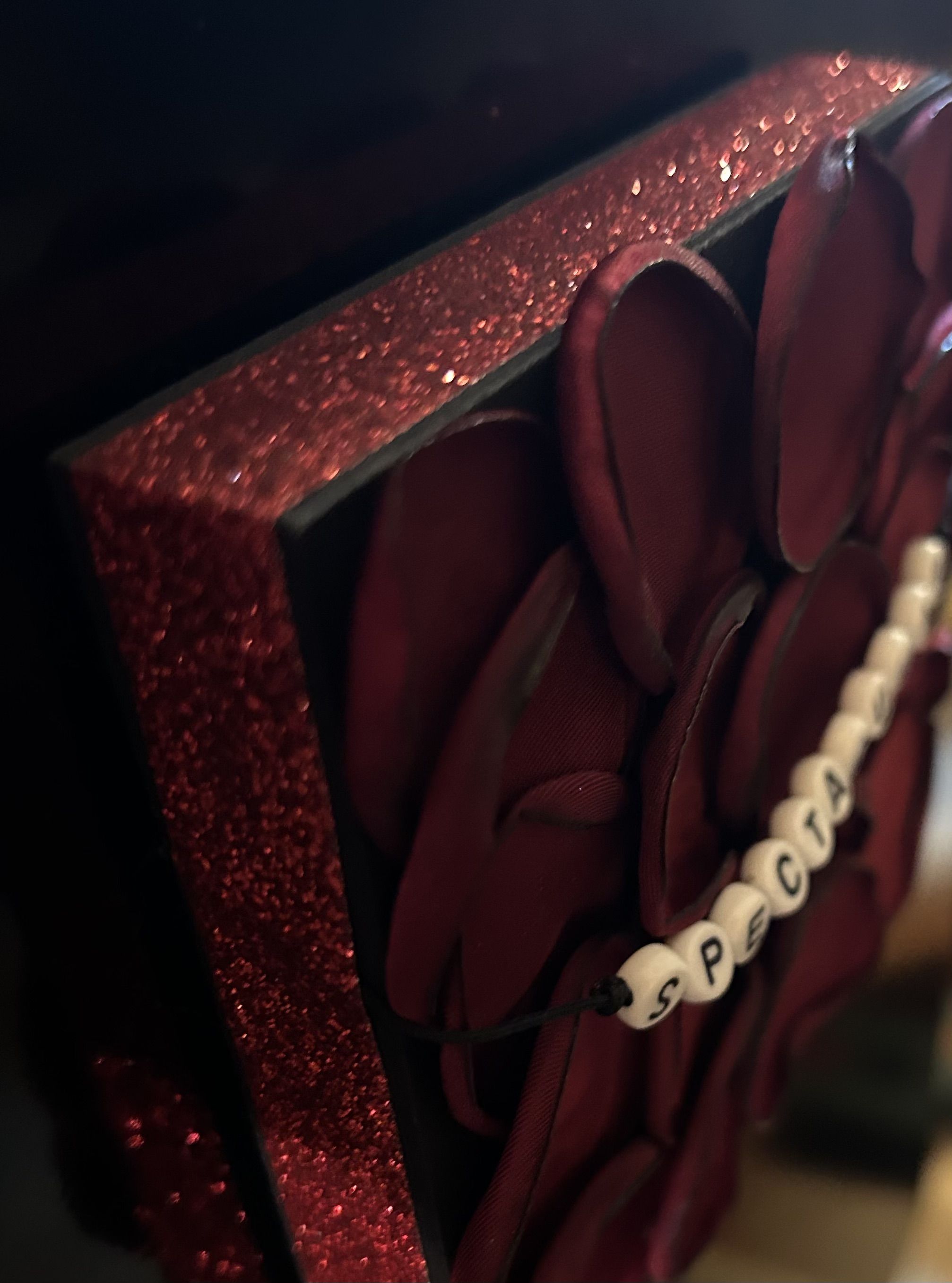 Where are my “American Beauty” fans at? For me, I had to have watched this move at least 20 times in my late teens into adulthood. Very controversial topics with, yes, a controversial main actor, but I appreciate the movie for what it is. It is iconic. I will never forget that floaty plastic bag! Truth be told, ever since I got some fake rose petals, I wanted to create a canvas full of them, and after I glued them all on, the word “SPECTACULAR” immediately came into my head. Exactly as Kevin Spacey says it to himself as he’s imagining underage (eek) Mena Suvari half naked and covered with rose petals on his bedroom ceiling. This portrays a Valentine’s concept of Lust. Of aching and longing for someone/something so beautiful, even if you shouldn’t be doing so. It’s pure fantasy.
