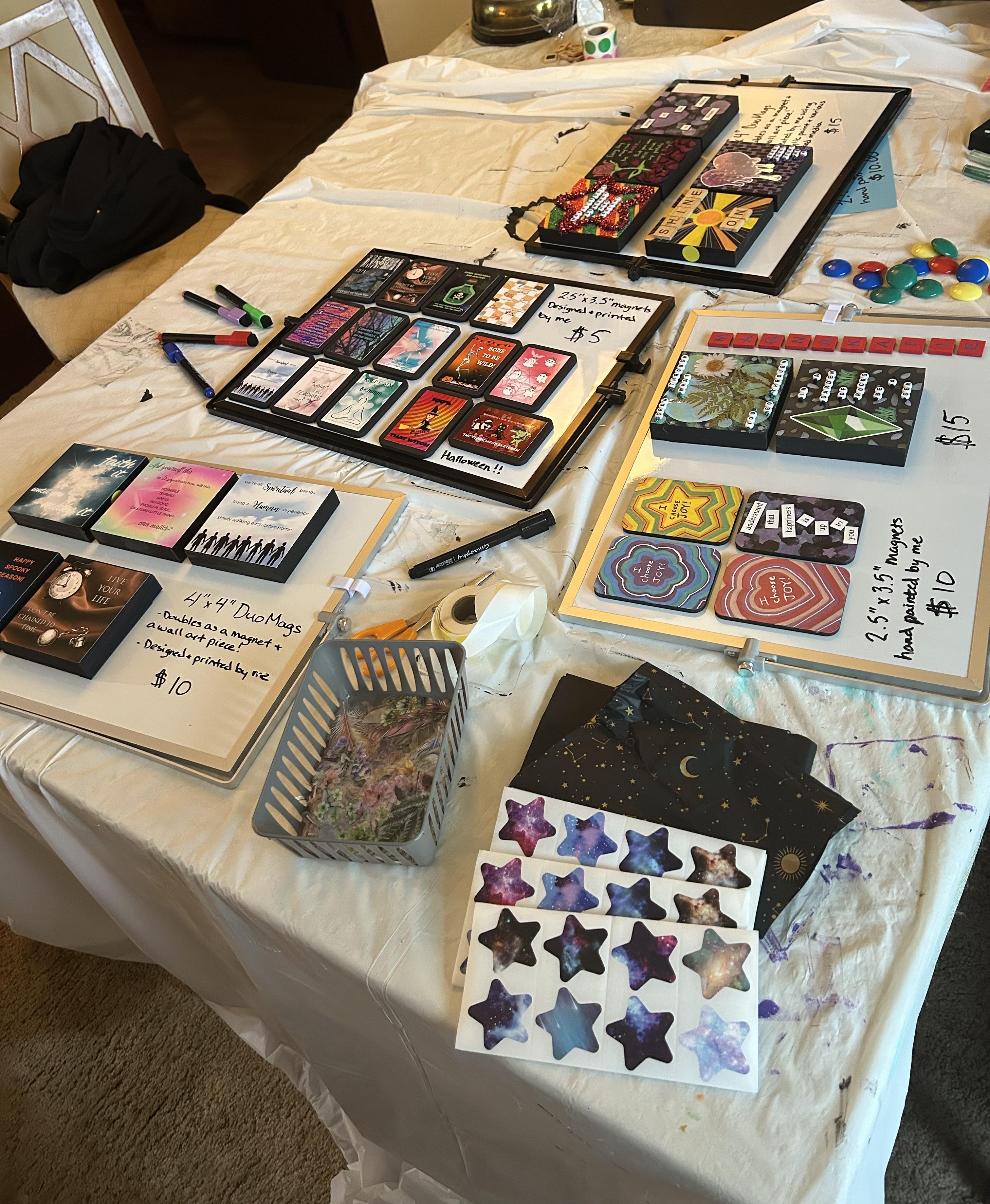 At first I thought this was just going to be a fun hobby, something to take my mind off of work, and a therapeutic release. It is definitely all of that but as I’m looking at my inventory and boxing everything up for tomorrow: tissue paper for wrapping, star stickers for sealing, a small basket of miscellaneous stickers to hand out as freebies with purchase, business cards (yes, they are magnets too) to hand out to anyone and every one, that directly links to my website which is up and running (small, yet mighty, and all thanks my love, Mark)- I am feeling a sense of pride in my efforts thus far and more than ever… hope and belief that this can actualize and turn into a full blown small business.